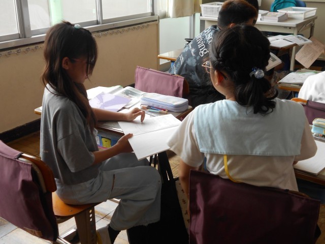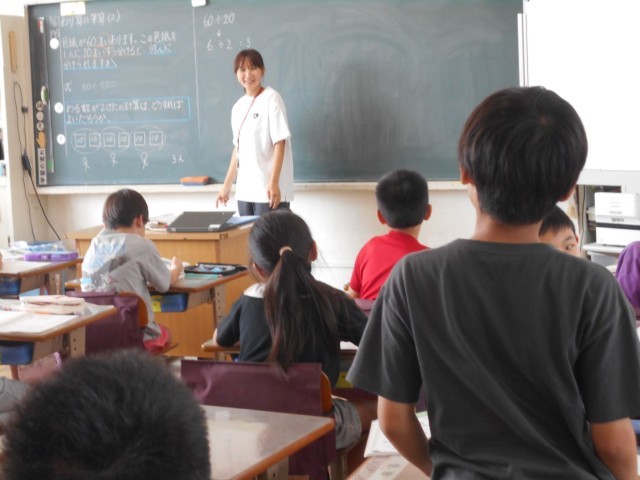 4年2組の2時間目の授業は算数です。今日の単元は『わり算の筆算を考えよう』で、わる数が2けたになるわり算のしかたの学習をしていきます。はじめに 60÷20 の計算のしかたを考えました。10枚の束を1つとすると、6つの束を2つの束ずつ分けるので、図でも式でも答えは 3 とすぐに正解することができました。次に 90÷20 の計算のしかたを考えました。今度の式はあまりが出てしまうので、じっくり考えなければなりません。子どもたちは自分で図や式を使ってじっくり考えたり、友達と意見を交換したりしながら根拠をもって正解を導こうと頑張る姿が見られました。一つずつ理解しながら学習を続けていきましょうね。
