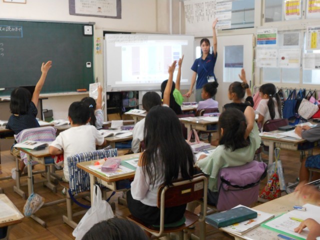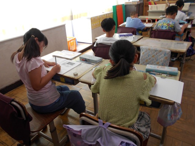 3年2組の1時間目は算数です。現在の単元は『10000より大きい数を調べよう』です。2年生のときに学習した「1000より大きい数」より3年生ではさらに大きい数の学習をします。今日は「入場けんは全部で何まいありますか」という問題です。束の数をそれぞれの位取り表の中に書いていきます。1000枚の束が24こあることをどのように読んだり書いたりすればいいかを考えました。みんなで試行錯誤しながら、「1000枚の束が10こで10000、24こだと24000」であることがわかりました。どの子も真剣に取り組む様子が見られました。