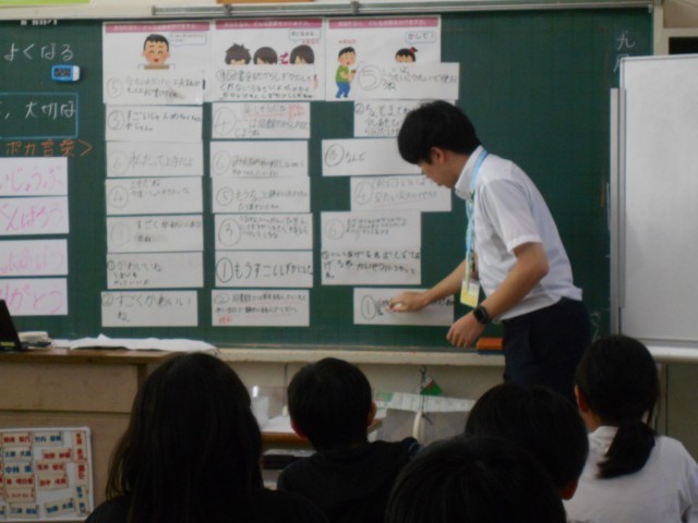4年1組の3時間目の授業は学級活動でした。今日は「4年1組がもっとなかよしになるまほうの言葉」についてみんなで考えます。学級で過ごしていると、人が悲しい気持ちになる「ちくちく言葉」や嬉しい気持ちになる「ぽかぽか言葉」がどちらも聞こえることがあります。では、学級でみんな仲良く過ごすためにはどのような言葉を使えばいいのでしょう?そこで、なかよく過ごすために「相手の立場で考えた言葉選び」についてみんなで考えました。4年1組が「なかよしになるまほうの言葉」であふれるクラスになるようにこれからもみんなで力を合わせてがんばりましょう!!