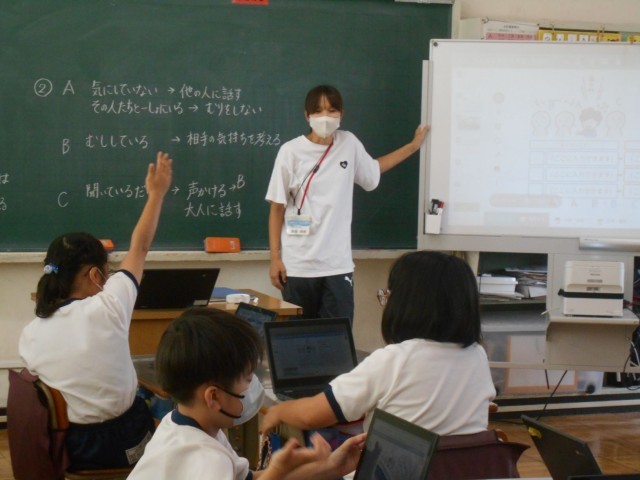 4年2組の4時間目は学級活動です。今日は『いごこちのよいクラスにするために大切なことを考えよう』をテーマに話し合いをしました。タブレットに配信された「こんなときどうする?」の場面を見ながら、被害者、加害者、周りで見ている人の3者の行動から「良くない行動」を見つけ「その解決策」を考え、タブレットに自分の意見を書き込みます。「良くない行動を見つけたら注意する」「相手の気持を考えて行動を変える」「大人に話す」など自分なりの解決策を書き込むことができました。現在八條小学校では、『いじめ撲滅授業』を各学級で実施しています。どの学級もいじめのない「いごこちのよいクラス」になるように頑張っていきましょう!!
