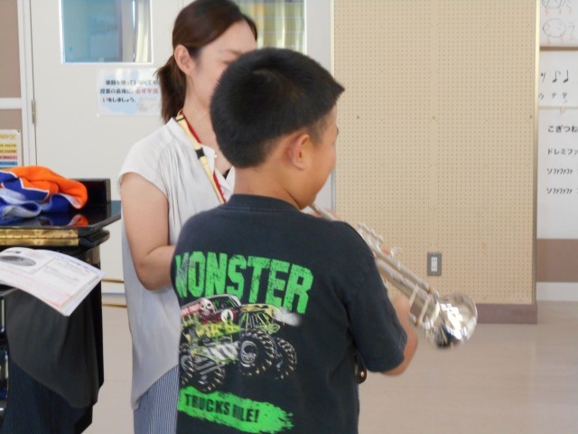 3年2組の4時間目の授業は音楽です。今日の学習は「トランペットとホルンのひびきにしたしみましょう」でした。最初に3年生から学習をはじめたリコーダーで「メリーさんのひつじ」を演奏しました。2つの旋律が重なってとてもきれいな音色で演奏することができました。次に管楽器の学習をしました。初めて間近にみる管楽器に子どもたちは大興奮でした。代表で一人の児童がトランペットを演奏してみました。初めてマウスピースを使って演奏したのに、上手に音を出すことができました。「演奏したい人は来週の休み時間に音楽室に来てください。」と先生が声をかけるとまたまた大興奮!!管楽器の音色に親しむことができましたね。