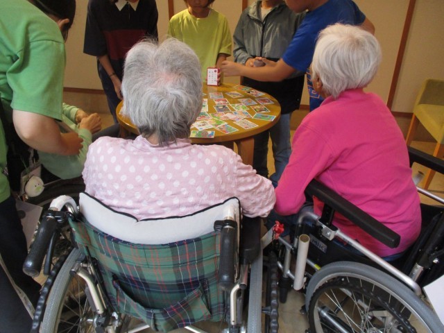 4年2組は2・3時間目に「杜の家やしお」を訪問しました。総合的な学習の時間の『ふるさと』の学習の一環で、入所している方との交流を行いました。初めは「次の空へ」の歌を2部合唱で行いました。ソプラノの声がとてもきれいで、ハーモニーが素敵でした。その後、グループごとに入所している方々と交流をしました。写真は折り紙とかるたの様子です。他にもこまや福笑い、けん玉やヨーヨー、魚釣りを行いました。みなさんとても楽しそうに活動していて、子どもたちも『すごいね』と褒めてもらえてうれしそうでした。今日まで準備を頑張ったかいがありましたね。明日は4年1組の訪問です。