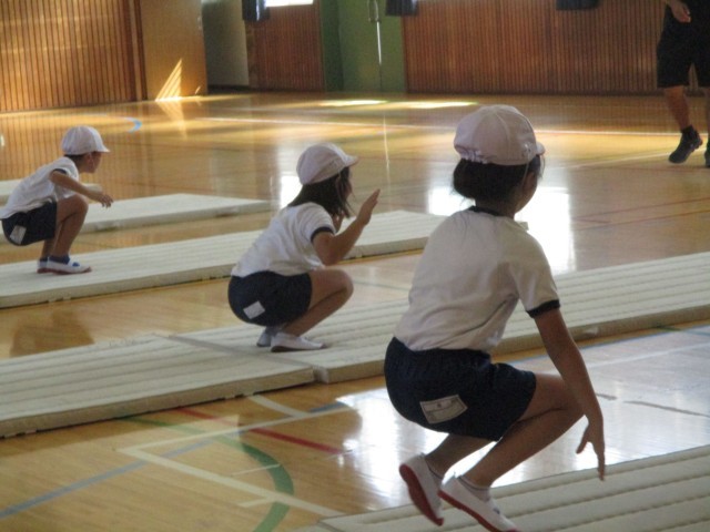 2年生の4時間目は体育です。今日は2年生合同で『マットを使った運動』をしました。体育館の空調工事のためしばらく体育館を使うことができなかったので、久しぶりのマット運動です。みんなで「せえの!」と声をかけながら協力してマットの準備をしました。また、先生の指示に従って、キビキビとマット運動の学習をする姿を見ることができました。ブリッジはどの児童も上手で、中には片足を上げてきれいなブリッジを披露している子もいました。また、犬やうさぎ、クマなど動物になりきった動きもとても上手でした。久々のマット運動に張り切って取り組む様子を見ることができました。