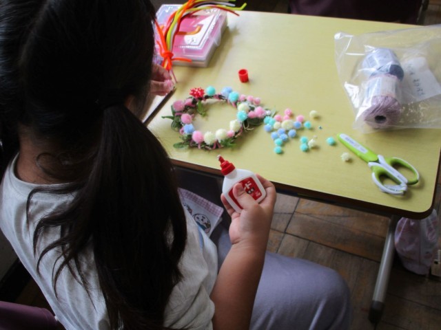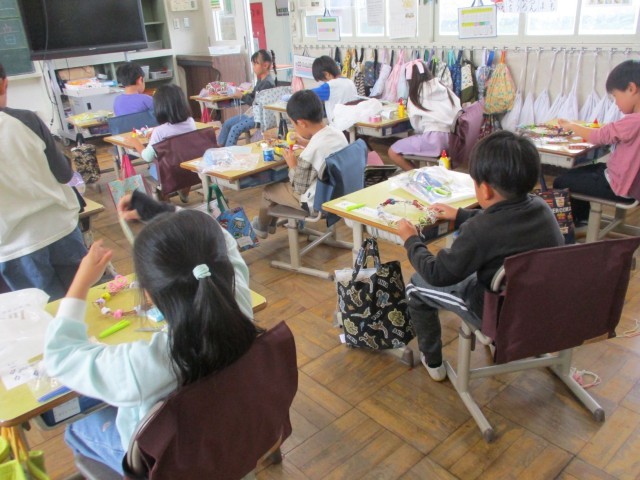 1年1組の3時間目は図工です。今日の学習は「リースをかざりつけよう」です。生活科で育てた朝顔が枯れてしまったので、先日そのくきやつるを使ってリースを作りました。今日はいろいろな材料をもってきて、そのリースに飾り付けをしました。モールや毛糸、ふわふわぽんぽんなどの小さい飾りをボンドでくっつけて素敵なリースを作ります。「クリスマスに飾れるかな?」「かわいいリースにするぞ!!」みんな真剣に飾り付けをしていました。春に植えた朝顔をたくさん観察して、最後はリース作り・・・。さまざまな学習ができましたね。