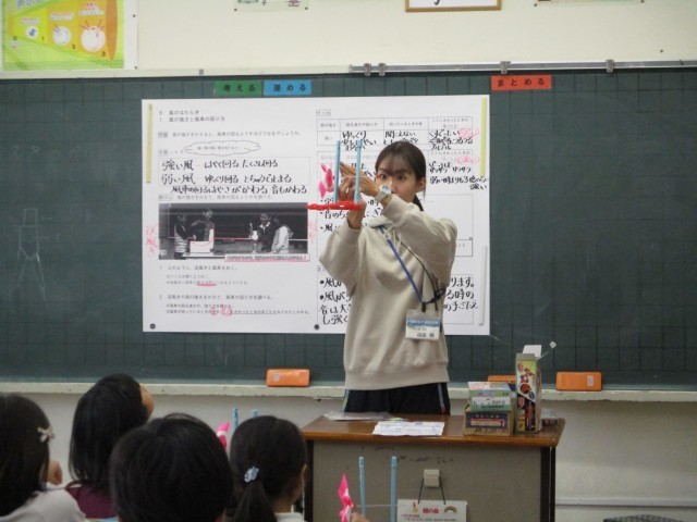 3年1組の3・4時間目の授業は理科です。現在の単元は『風のはたらき』です。ミニ風車を使って実験をしていきます。今日は、前回実験した「風の強さをかえると、風車の回る様子はどうなるか」の結果をまとめました。実験の結果、風が強いほど風車は速く回り、回っているときの音も大きくなることがわかりました。次の時間は「風の強さによってものを持ち上げる力が変わるか調べよう」の実験をします。これからの実験も楽しみですね。