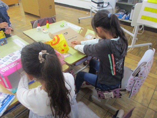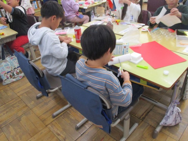 1年2組の2・3時間目の授業は図工です。今日は『うきうきボックス』〜かみのはこをかざってたのしくへんしんさせよう〜の学習をしました。家から持ってきた箱を1つ選び、折り紙や色画用紙、ボンド、のり、はさみなどを使って飾り付けをし、箱を変身させていきます。「キャップの蓋もいっぱい持ってきたから、目にしよう!」「信号を作りたいから、この棒を半分に切りたいな」など。出来上がりを想像しながら黙々と作業を続け、どんどん作品を完成させていきます。どの子もいつもより集中して作品づくりをする様子をみることができました。残った材料は今後図工や生活科で活用します。材料集めのご協力ありがとうございました。