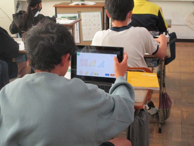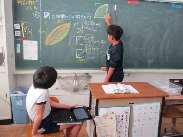 6年1組の1時間目の授業は算数です。現在の単元は『円の面積の求め方を考えよう』で、今日は「円を含む複合図形の面積」の求め方を考える学習でした。正方形の中にできた複合図形の面積を求めていきます。正方形=一辺×一辺 円=半径×半径×3.14 三角形=底辺×高さ÷2 など今まで学習した面積の公式を使って答えを導きだします。複合図形がどんな図形を組み合わせてできているかを読みとることが重要です。一人で自力で考えたり、友達と考えたり、タブレットの画面を見ながら考えたりと自分にあった方法で答えを見つけていきます。どの子も試行錯誤しながら真剣に考える様子をみることができました。いろいろな方法で答えを導き出すことができましたね。