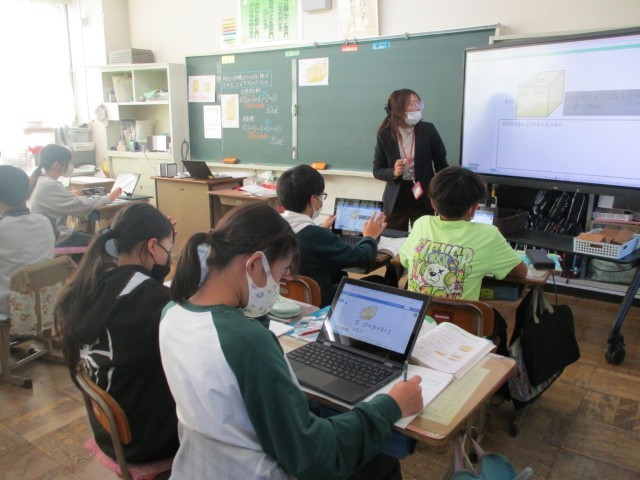 今日は、東部教育事務所と八潮市教育委員会の方々にご指導いただく学校訪問の日です。本校は算数の研究をしているので、主に算数の授業を見ていただきました。3・4時間目は各学級の公開授業で、どの学級も自分から進んで内容を理解しようとがんばる姿を見ることができました。また、5時間目は6年1組の算数の研究授業でした。現在の単元は『角柱と円柱の体積』で、今日の課題は「角柱の体積はどのようにすれば求められるか」です。『底面積×高さ』の公式を使って、三角形の底面の面積×高さの式を作って求めたり、2つ組み合わせて直方体にして、それを2でわって1つ分にして求めたり、いろいろなやり方を考えました。どの子も黙々と問題に取り組む様子を見ることができました。