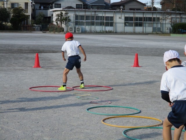 2年2組の1時間目は体育です。今日の学習は『力いっぱいとぼう!』〜高とびあそび〜でした。高とびあそびができる4つのコースを用意して活動しました。①ダンボールとミニハードル飛び越しコース ②跳び箱飛び越しコース ③ケンケンパコース ④円に合わせて飛ぼうコース の4つです。それぞれのコツは ①は両足を揃えてジャンプして飛び越します。②は跳び箱を降りると円があるので自分の利き足で降りてそのまま走ります。③はケンケンパの形においてある円に合わせて走ります。④円が並べてある通りに飛んでいきます。どのコースも順番にたくさん練習して、息があがっている子もいるほどでした。どの子も頑張る姿を見せてくれました。