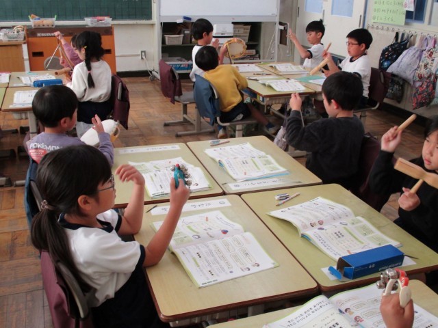 1年2組の4時間目は音楽です。今日の学習は『がっきとなかよくなろう』で、トライアングル、すず、タンブリン、ウッドブロックを使ってみんなで演奏しました。楽器からいろいろな音を見つけて素敵な音を探します。「こっ こっ」「しゃん しゃん」「ちーん ちーん」「ぱん ぱん」一つずつ楽器を持って演奏しました。今日のリズムは『たん たん たん うん』楽器ごとに番号を決めて順番にならしていきました。次に「1年2組音楽隊」の登場です。先生のあとに一列になってリズムに合わせて歩きながら演奏しました。どの活動もとても楽しくできました。