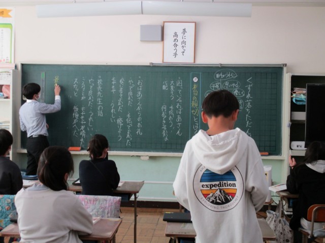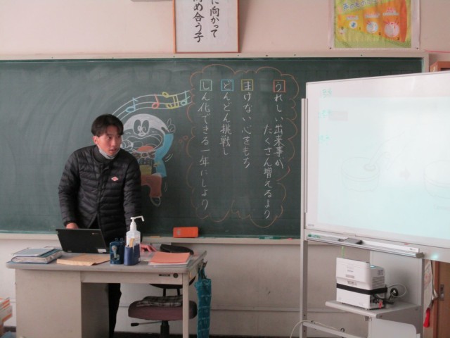 今日は令和7年度3学期始業式の日でした。12月の終業式の日に「1月8日始業式の日に全員笑顔で会いましょう!!」を冬休みのミッションとしていたので、始業式の後で全部の教室の子どもたちの様子を見に行きました。どの学級も満面の笑顔を見ることができました。5年2組の2時間目は道徳です。今日の題材は『くずれ落ちたダンボール箱』で、「本当の親切とは?」について考えました。「見返りを求めない」「だれにでも同じように」「相手のことを思って」などいろいろな意見が出ました。また、6年2組では黒板に「う→うれしい出来事がたくさん増えるよう」「ま→まけない心を持ち」「ど→どんどん挑戦し」「し→しんかできる1年にしよう」と書かれていました。『うまどし』の1年を馬のように全力で突っ走りましょう!!