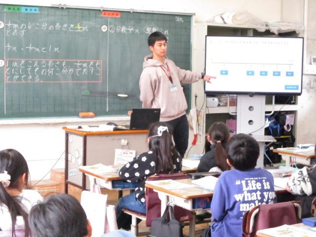3年1組の2時間目は算数です。現在の単元は『分数を使った大きさの表し方を調べよう』で、今日は「どうしたら1より大きい分数を表せるだろうか」を考えました。2年生のときに初めて『分数』の学習をはじめ、1/2、1/3,1/4のようなかんたんな分数を学習しましたが、3年生になってその分数の世界が広がってきました。今日は1より大きい分母が5の分数を探していきました。1=5/5、2=10/5となることを見つけるうちに4年生で学習する分子と分母の秘密まで考えてしまいました。今日の学習が4年生以上の分数の学習にもいきてきます。しっかり覚えておきましょう!!