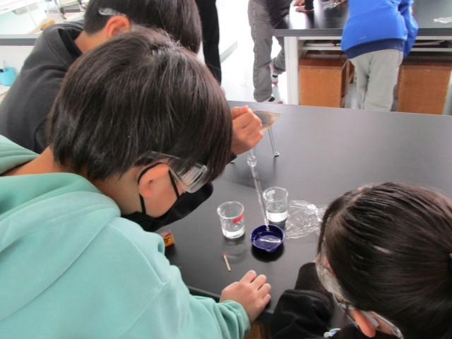 5年1組の4時間目は理科です。現在『もののとけ方』の学習をしています。今日の実験は「水溶液にとけているものをとりだすにはどのようにしたらよいか」でした。前時までに水の量を変えたり、水の温度を上げたりしながらとけ方の特徴を調べていましたが、今度は取り出すための実験です。ミョウバンと食塩の水溶液を使って ①温度を下げてみる ②アルコールランプで熱してみる の2種類の実験をしました。氷で冷やしたらミョウバンの方に徐々に白い粒がでてきました。また、熱してみたら水分がなくなり、両方とも白い粉が残りました。みんなで協力しながら実験ができました。