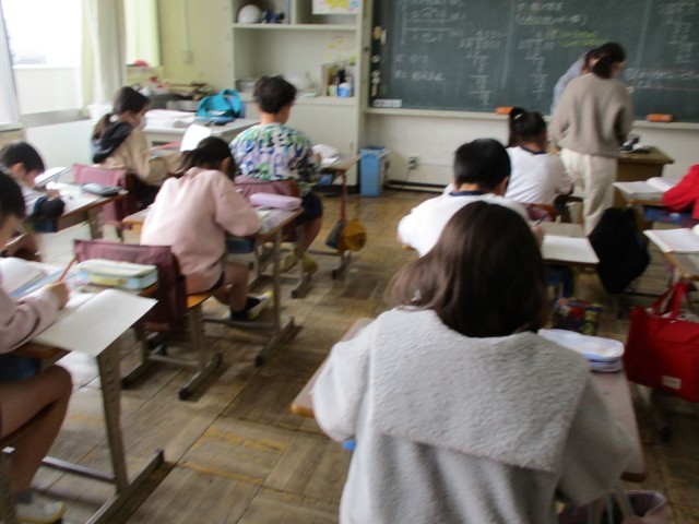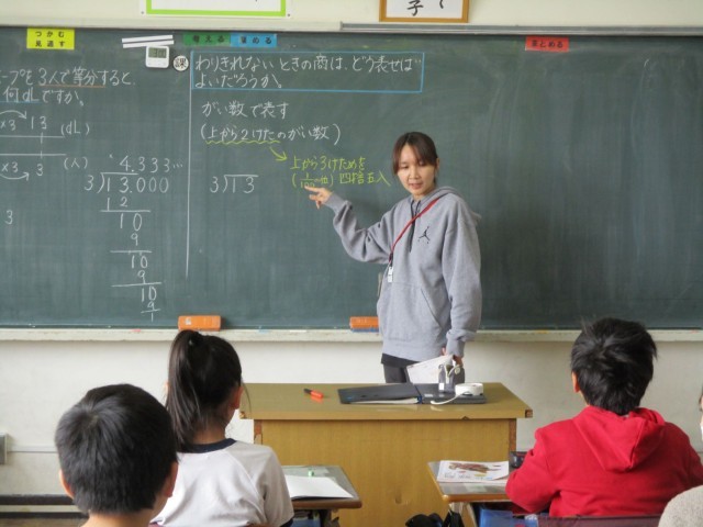 4年2組の3時間目は算数です。現在『小数のかけ算とわり算』の単元を学習しています。今日の課題は「わりきれないときの商はどう表せばよいか」でした。13dlのスープを3人で等分したときの一人分の量を考えます。13÷3を筆算すると、答えは 4.33・・ になります。このようにわりきれないときは、どのように答えたらよいか。今回は 商を上から2けたの がい数 で表します。つまり上から3けた目の小数第2位を四捨五入します。3は5より小さいので、切り捨て。したがって答えは『4.3』です。わり算に少し手こずりましたが、どの子も集中して問題に向き合い、がい数を使った答え方を覚えることができました。