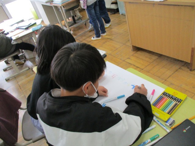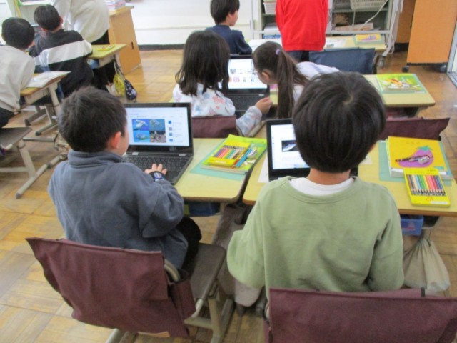 1年2組の3時間目は国語です。現在「ことばっておもしろいな〜ものの名まえ〜」の学習をしています。1年生で学習した ひらがな や カタカナ を使ってカードを作ってお店やさんごっこをします。今日は看板や品物カードを作って自分たちで決めたお店やさんの準備をしました。やおやさん、くだものやさん、さかなやさんなど・・・中には ぶきやさん もありました。タブレットを使ってものの名前を調べて、絵と字を書いて品物カードを作りました。見たこともない果物や魚などもありました。ものの名前をたくさん知ることができましたね。今度のお店やさんごっこも楽しみです。