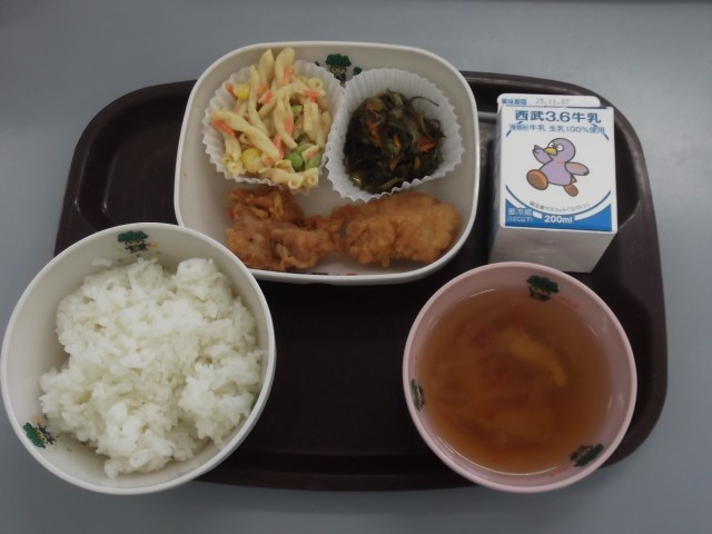 本日の献立は、ごはん、牛乳、鶏肉の唐揚げ、和風マカロニサラダ、こまちゃんときざみ昆布の煮物。沢煮椀です。