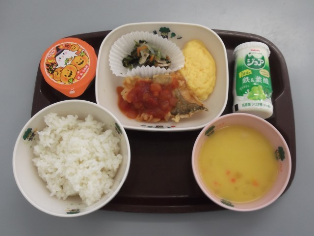 本日の献立は、ごはん、ジョア、たらフリッターのトマトソース、ほうれん草のイタリアンサラダ、オムレツ、パンプキンポタージュ、ハロウィンパンプキンババロアです。