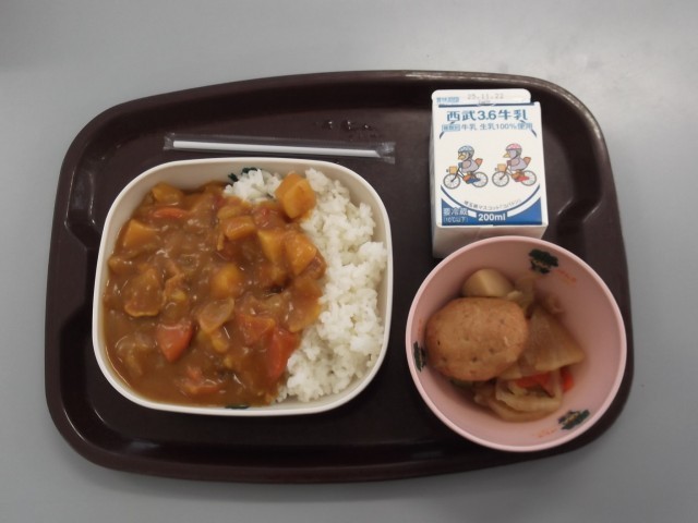 本日の献立は、トマトカレー、牛乳、くわい入りつくねのせ里芋と野菜の和風煮です。