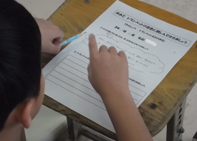 鑑賞の授業で、トランペットの音色に子供たちは聞き入っていました。