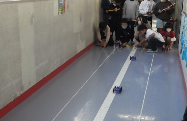 課題「ゴムをどうすれば、車をもっと遠くまで走らせることができるか」を解決するために、ゴムの本数を増やして実験をしています。