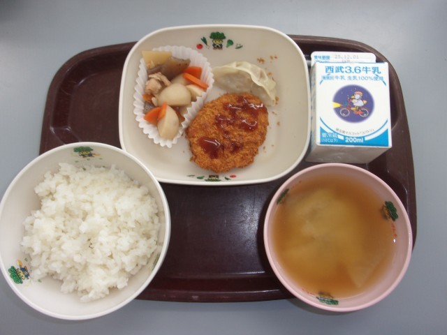本日の献立は、ごはん、牛乳、コロッケ、埼玉県産黒豚入り蒸し餃子、筑前煮、みそ汁です。