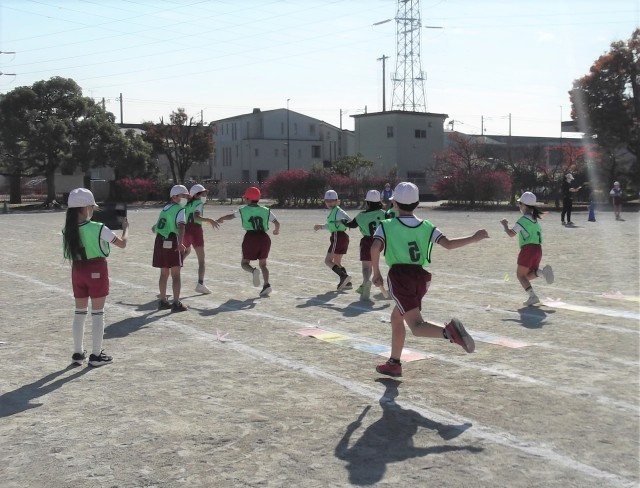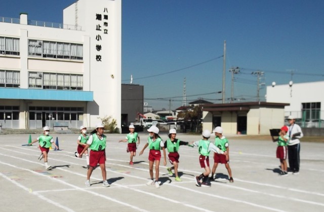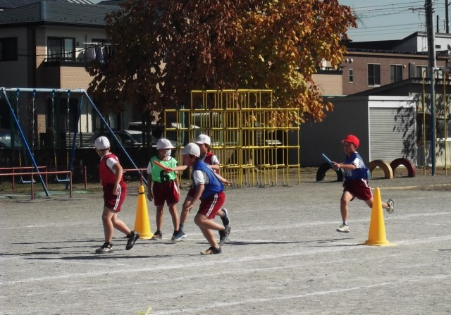 改善点を話し合うために、リレーのバトンパスの様子をタブレットで撮影しています。