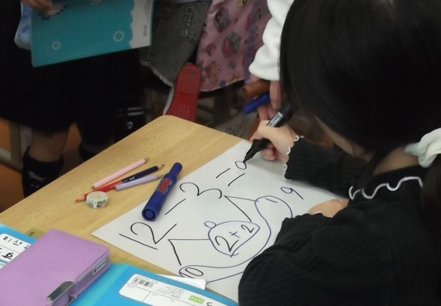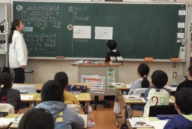 12-3を10のまとまりからだけでなく、ばらの2からひく方法も考えて、考えを共有しています。