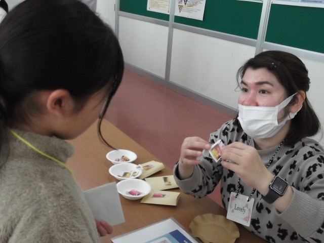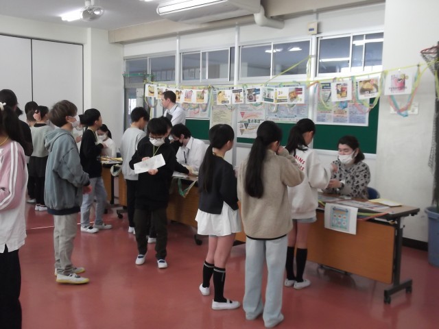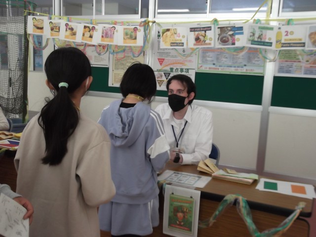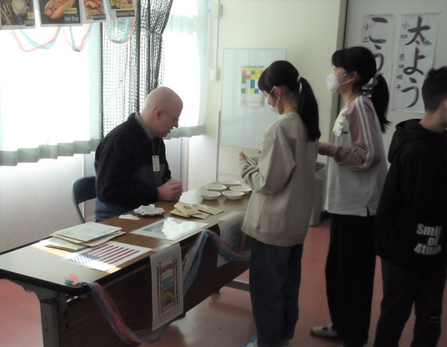 市内のALTの先生7名と5年生が、お買い物を英語で行っています。「What do you buy?」「One cake.」