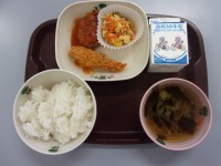 本日の献立は、ごはん、牛乳、豚肉の南蛮漬け、ほうれん草ときのこのソテー、キャベツのこぶあえ、みそ汁です。