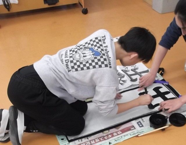お手本を何度も見て、一画の長さを確認しながら、慎重に一画一画を書いています。