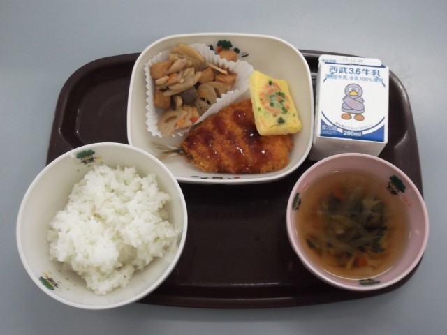 本日の献立は、ごはん、牛乳、あじフライ、ちぐさやき、厚揚げの根菜煮、地場産大根のすまし汁です。