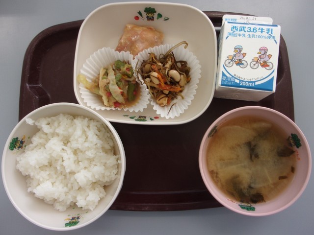 本日の献立は、ごはん、牛乳、鶏肉の塩こうじやき、いんげんのツナあえ、さざみ昆布の煮物、みそ汁です。