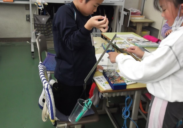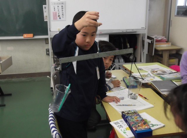 課題「みんなが同じ重さを同じ数で表すにはどうしたらよいか」の解決に向けて新しい単位「グラム」を学習し、その後、一円玉を使って重さを図っていました。