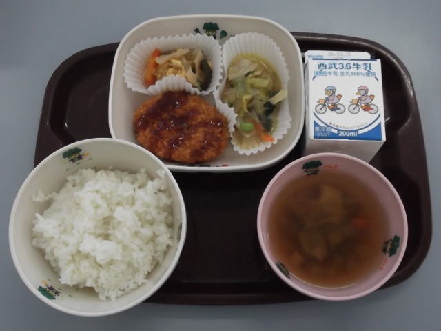 本日の献立は、ごはん、牛乳、コロッケ、八宝菜、中華風卵炒め、かみかみ中華スープです。
