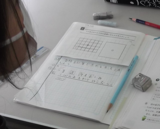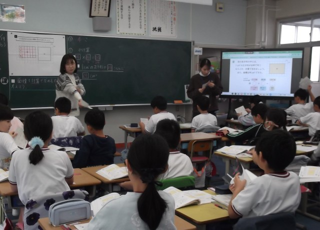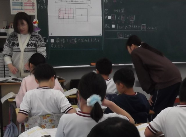 長方形の面積を計算で求める方法を考えています。教員2名で授業をするので、思考や手が止まっている児童に個別指導をすることができます。