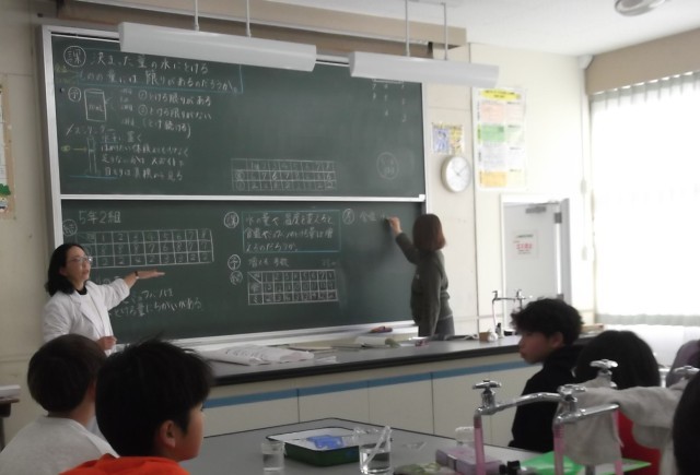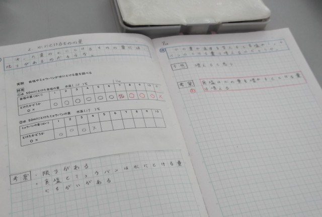 課題「水の量を変えると食塩やミョウバンの溶ける量は増えるだろうか」を解決するために、水の量を変えて実験をしました。多くの児童の予想通り、食塩は溶ける量が増えていました。