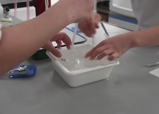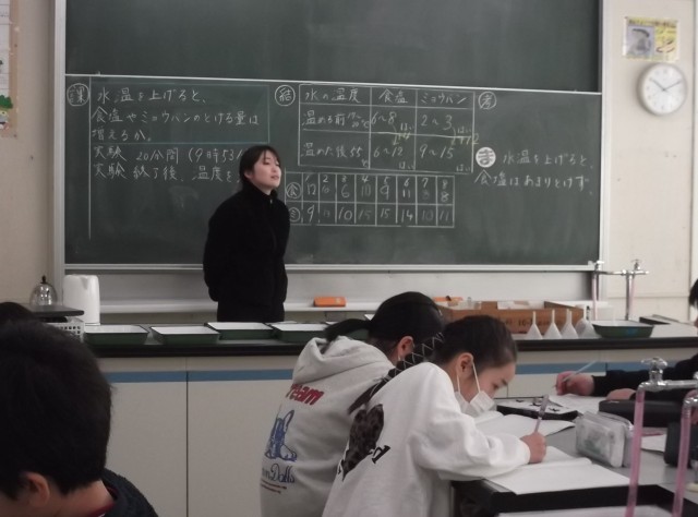 5年生理科 公開日 2026/01/29 更新日 2026/01/29 学校生活のようす 課題「水温を上げると、食塩とミョウバンの溶ける量は増えるか」を解決するために、水温を変えて実験をしました。実験結果ら考察をする力、着実についてきています。