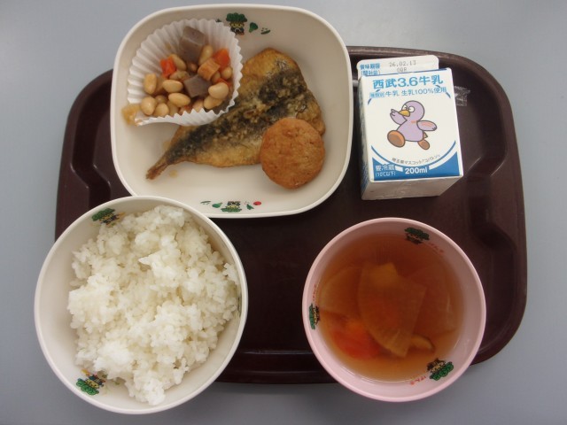 本日の献立は、ごはん、牛乳、いわしの蒲焼風、くわい入りつくねのあまから、大豆とこんにゃくの煮物、けんちん汁です。