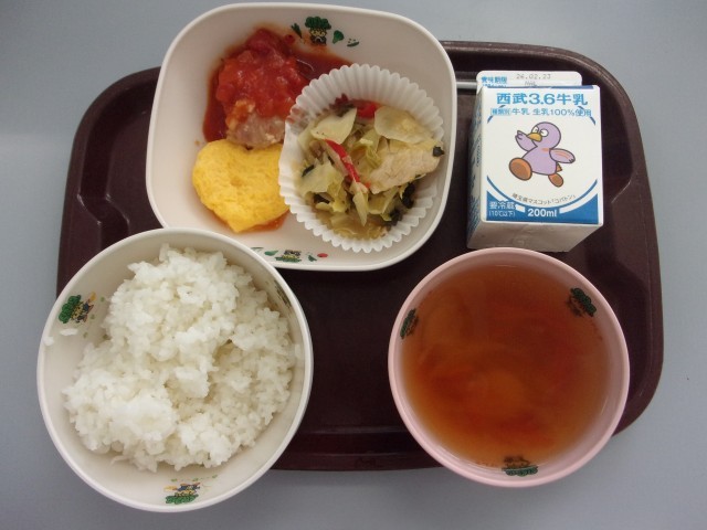 本日の献立は、ごはん、牛乳、チキンのトマトソース、ハート型オムレツ、肉野菜ソテー、コンソメスープです。