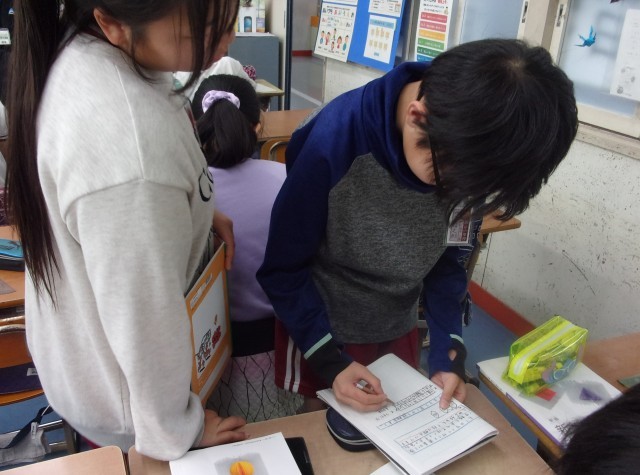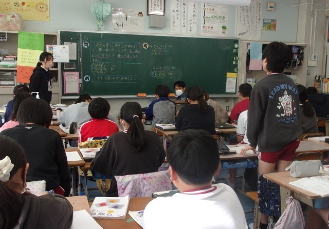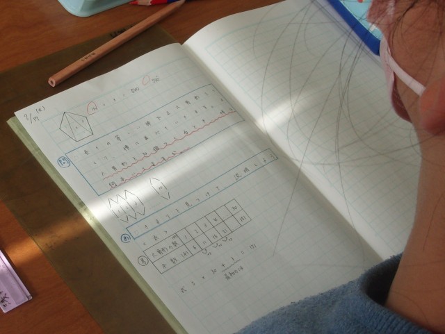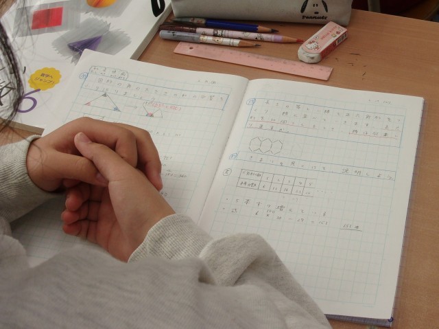 「棒で六角形をつくり、横に30個並べたとき、棒は何本いりますか」の問題を、図や表を利用して考え、5本ずつ増えていくことに着目をして、式をつくっていました。