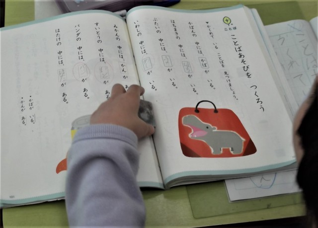 1年生国語 公開日 2026/02/19 更新日 2026/02/19 学校生活のようす 文の中にかくれている言葉を述語に着目しながら見つけています。「はちまきの中には○○がいる。」 はち?まき? 述語がいるだから、はちと全員が答えていました。
