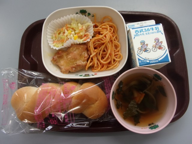 本日の献立は、ツイストパン、牛乳、鶏肉のハニーマスタード焼き、ナポリタン、シーザーサラダ、オニオンスープです。