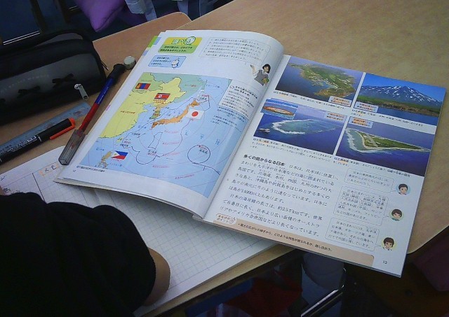 課題「日本の国土は、どのような特色があるだろうか」を解決するために、教科書や地図帳、動画を利用して調べています。日本は島国で海に囲まれていて・・・日本のはじの島を確認していました。