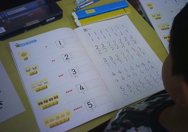 1,2,3,4,5の数字の読み方と書き方を学習しています。きれいに1,2,3,4,5をかいている児童がたくさんいます。