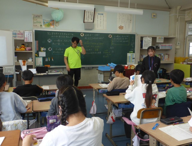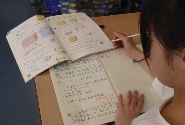 子どもたちの学力を高めるために、2名の教員で算数の授業を行っています。一辺が1cmの立方体の体積が1㎤ということを学習し、2つの箱の体積を比べる方法を考えています。