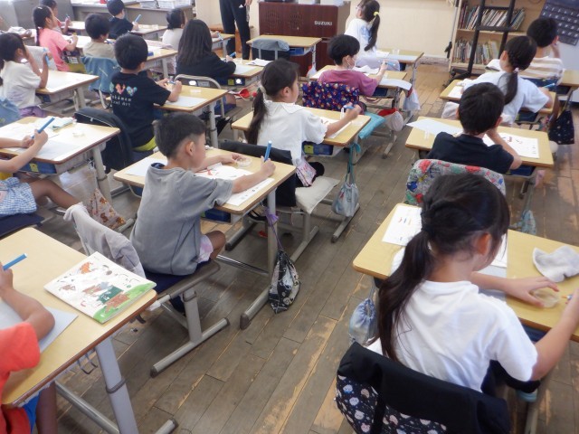 上の写真は、1年生の書写の様子です。今日は、水筆を使って書く練習をしていました。「書けました!」「消えるから、すぐにまた書けます!」と、嬉しそうに教えてくれた子供たちです。