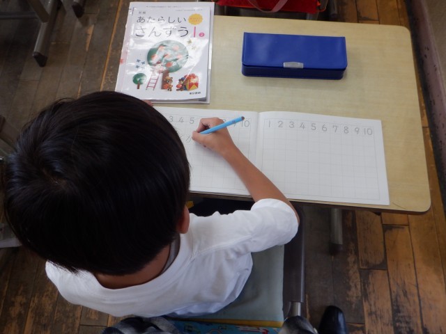 上の写真は、1年生の算数の様子です。文章題を解きながら、たし算の計算のしかたを考えていました。