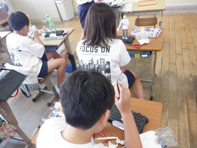 下の写真は、6年生の図工の様子です。粘土芯材を使って、剣士や自動車整備士、配達員などの将来の夢を形で表現していました。