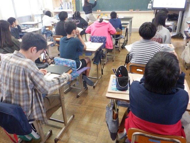 下の写真は、6年生の外国語の様子です。音声を聞いて、文字の音に慣れ親しむ学習を行っていました。