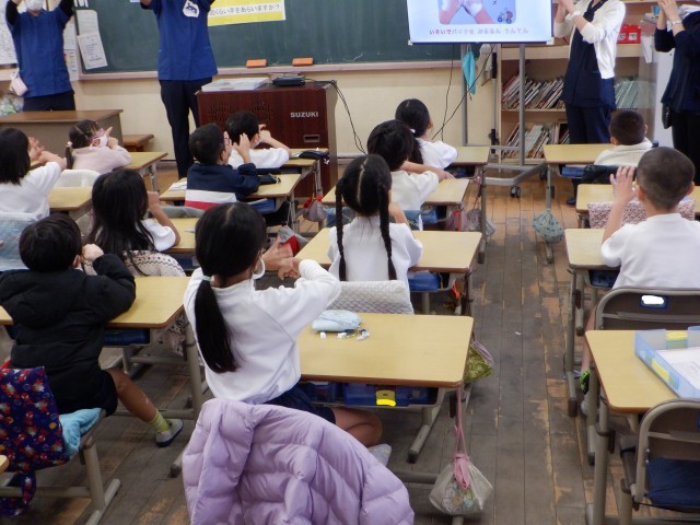 真ん中と下の写真は、1年生の様子です。今日は外部講師を招聘し、手洗い教室を行いました。「どんな時に手を洗うのか」「1日に何回くらい手を洗うのか」「どうして手を洗うのか」考え、どうすれば上手に手を洗うことができるのか教えてもらいました。
